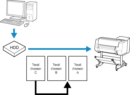 Les tâches d'impression traitées par l'imprimante sont collectivement nommées « file d'attente des tâches ». Vous pouvez supprimer ou avancer des tâches dans la file d'attente des tâches selon le besoin.