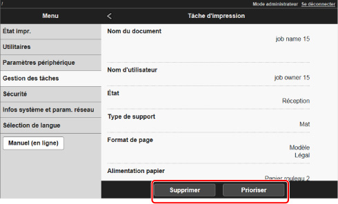 Sélectionnez la tâche d'impression, puis Supprimer ou Prioriser.
