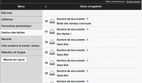 Les détails des tâches d'impression stockées sur le disque dur de l'imprimante (tâches enregistrées) peuvent être affichés comme suit.