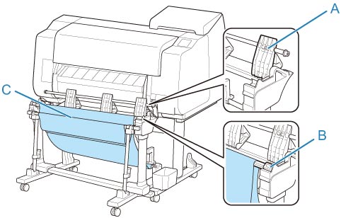 로드(조절 가능)스탠드 위쪽의 홈(B)에 끼워 넣은 다음 로드(고정)(C)를 프린터를 향해 아래로 밉니다. 그런 다음 스태커 구성이 위치 2가 되도록 플래퍼(A)를 세로로 설정합니다.