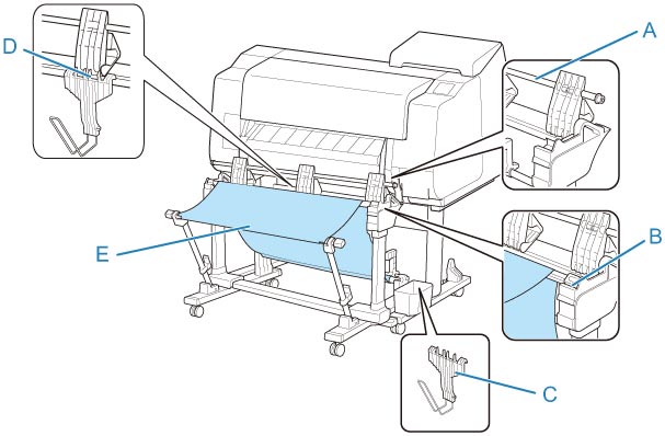 로드(고정)(E)를 사용자 쪽으로 당겨 내립니다. 로드(조절 가능)스탠드 위쪽의 홈(B)에 끼워 넣은 다음 스태커 구성이 위치 3이 되도록 플래퍼(A)를 세로로 설정합니다. 그런 다음 스탠드액세서리 보관함에 보관된 용지 스토퍼(C)를 플래퍼의 오른쪽에서 두 번째 부분(D) 아래에 장착합니다.