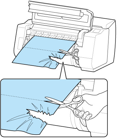 Удерживая бумагу с обеих сторон, вытяните замятую часть вперед. Воспользуйтесь ножницами или режущим инструментом, чтобы отрезать напечатанную или смятую часть.