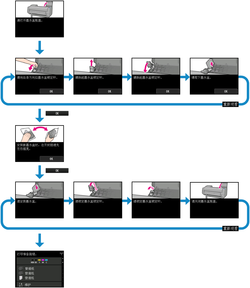 装入纸张、更换墨水盒或执行其他操作时可以参阅触摸屏上的说明。