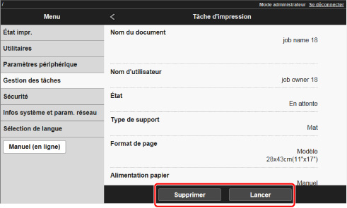 Si le type ou le format du papier chargé ne correspond pas aux paramètres de la tâche d'impression reçue lorsque vous avez défini Détect. incohérence param. pap. sur Mettre tâche en attente dans le panneau de contrôle, la tâche d'impression est conservée sur l'imprimante en tant que tâche en attente dans la file d'attente des tâches.