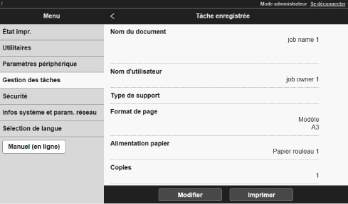 Les détails des tâches d'impression stockées sur le disque dur de l'imprimante (tâches enregistrées) peuvent être affichés comme suit.