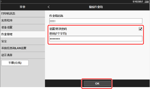 如果要提高安全性,可以为个人作业箱指定密码。 设置密码后,更改个人作业箱的设置,以及显示、打印、删除、移动和更改保存在个人作业箱内的作业时均需要该密码。