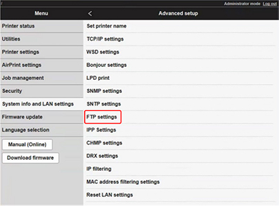 Toque Config. impr. directa desde FTP (Direct print settings from FTP).