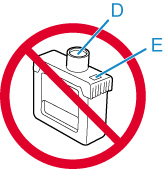 Non toccare mai i fori dell'inchiostro (D) o i contatti metallici (E). Tale azione potrebbe causare macchie, danneggiare il serbatoio d'inchiostro e influire sulla qualità di stampa.