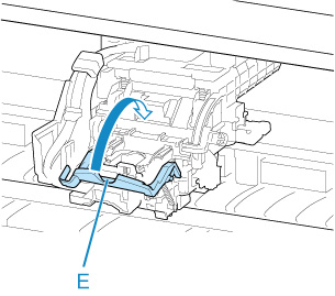 Coloque o dedo na peça central (E) da alavanca de bloqueio da cabeça de impressão e incline-a para frente.