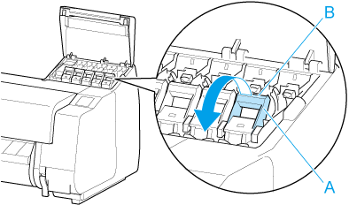 Ziehen Sie das Griffteil (A) des Sperrhebels für den Tintenbehälter der Farbe, die ausgetauscht werden soll, zu sich, während Sie den Knopf am Griffteil (B) nach unten drücken.