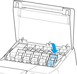 Schieben Sie den Sperrhebel für den Tintenbehälter fest nach unten, bis er nicht mehr zurückschnappt.
