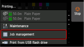 Gestión de trabajos (Job management) en la pantalla de inicio durante la impresión.