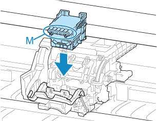 Orientez les orifices d'encre (M) vers l'avant et insérez la tête d'impression dans le chariot.