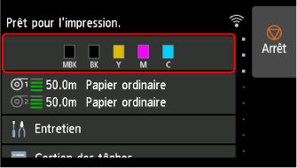 - Il est également possible de remplacer une cartouche d'encre en cours d'impression, en cas d'annulation des travaux d'impression ou lorsque le papier est avancé.