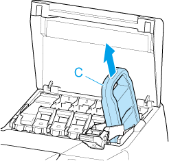 Tenez le réservoir d'encre par les poignées (C) et retirez-le.