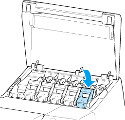 Poussez la partie poignée du levier de verrouillage de cartouche d'encre fermement en l'enfonçant jusqu'au bout.