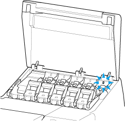- Il se peut qu'il y ait de l'encre autour des orifices d'une cartouche d'encre que vous avez retirée. Manipulez avec précaution les cartouches d'encre durant le remplacement. L'encre peut tacher les vêtements.