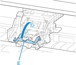 Coloque o dedo na peça central (E) da alavanca de bloqueio da cabeça de impressão e incline-a para frente.