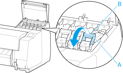 Puxe a peça da alça (A) da alavanca de bloqueio do cartucho de tinta da cor a ser substituída em sua direção enquanto pressiona o botão localizado na parte de trás da peça da alça (B).
