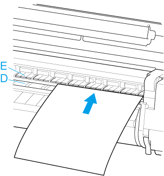 Вставьте лист бумаги в книжной ориентации стороной для печати вверх между валиком (D) и фиксатором бумаги (E).