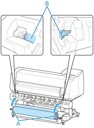 Удерживайте фланцы (A) так, чтобы ограничитель держателя был слева, выровняйте вал держателя рулона по левому и правому направляющим пазам отверстия держателя рулона (B) и загрузите рулон.
