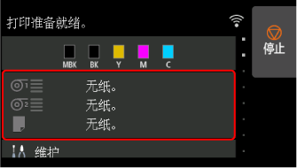 如果卷纸自动供纸设置为启用且安装的卷纸支架中没有装入卷纸,正在准备进纸...将出现在操作面板上。 在这种情况下,按操作面板上的停止按钮,取消送纸。