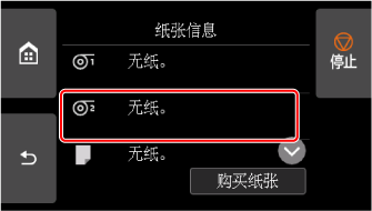 如果卷纸自动供纸设置为启用且安装的卷纸支架中没有装入卷纸,正在准备进纸...将出现在操作面板上。 在这种情况下,按操作面板上的停止按钮,取消送纸。