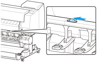 根据纸张的不同,送入纸张时卷纸可能会被刮擦或不能完全送入卷纸。 在这种情况下,必须先在触摸屏上将纸张保留设置设置为解除保留,然后手动进纸。 抬起释放杆,送入卷纸直至其前端出现在压纸滚筒上,放下释放杆,然后继续执行下一步。 但是,如果将纸张保留设置设置为解除保留,则无法自动切换上行和下行卷纸。