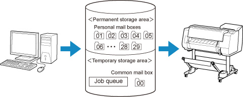 - Druckaufträge, für die Sie unter Ausgabemethode (Output Method) die Option Drucken (Print) ausgewählt haben, werden in der gemeinsamen Mailbox gespeichert und als gespeicherte Aufträge eingestuft.