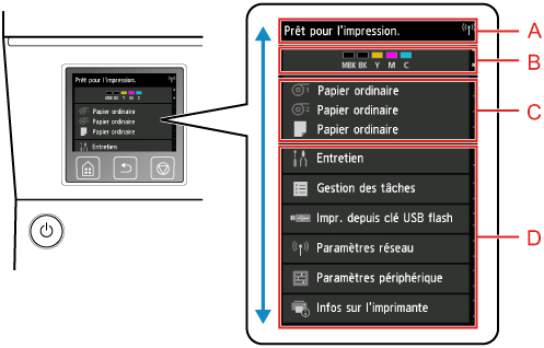 Depuis l'écran ACCUEIL, vous pouvez consulter l'état de l'imprimante et sélectionner les menus Maintenance, Paramètres et d'autres menus. Déplacez l'écran ACCUEIL vers le haut et le bas et sélectionnez la position d'affichage.