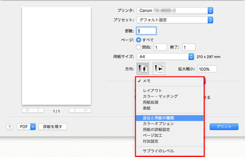 拡大/縮小印刷やフチなし印刷など、さまざまな印刷の設定は、図のように、ダイアログボックスのパネルを切り替えて行います。