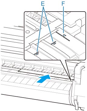 カット紙の手前側の端を基準に、位置合わせを行うことも可能です。その場合は、カット紙の手前側の端をプラテン上の刻印(E)に、右側面を右側の紙合わせライン(F)に合わせてセットしてください。