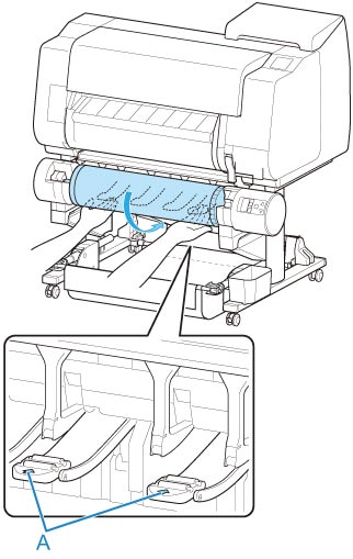 ロールユニットを給紙装置として使用する場合、バスケットのポジションによって、[フチなし印刷]や用紙セット時の[先端プレカット]で排出されるロール紙の切れ端がロールユニット内に入り込み、紙詰まりや印刷不良を起こす可能性があります。その場合は、バスケットのポジションを変えて使用してください。(「バスケットのポジション例」参照)