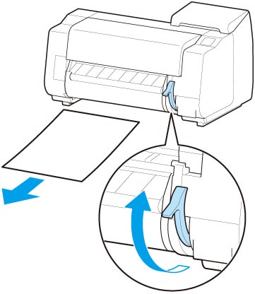 タッチスクリーンにカット紙取り外しのガイダンスが表示されたら、カット紙を持ちながらリリースレバーを上げ、カット紙を取り外す