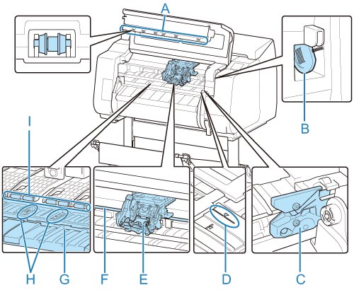 - プリントヘッドを動かします。印刷するための重要な部品です。(「キャリッジ」参照)