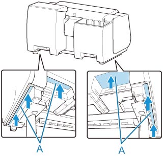 プリンターを持ち運ぶときは、左右と後ろ側の底面にある運搬用グリップ(A) をしっかりと持ってください。他の場所を持つと不安定になり、落としてけがをする場合があります。