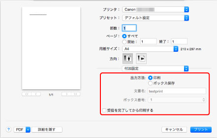 印刷ジョブが、プリンターのハードディスクの恒久保存領域に保存されます。印刷は行いません。