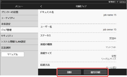印刷ジョブを選び、[削除]または[優先印刷]を選ぶ