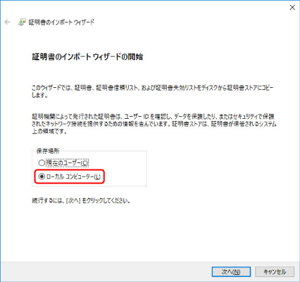 [証明書のインポートウィザードの開始]画面で[ローカルコンピューター]を選びます。