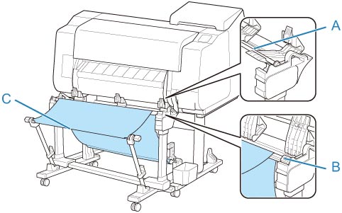 Установите стержень (регулируемый) в паз (B) в верхней части подставки, а затем опустите стержень (фиксированный) (C) к принтеру. Затем установите заслонку (A) вертикально, чтобы установить приемник бумаги в положение 2.