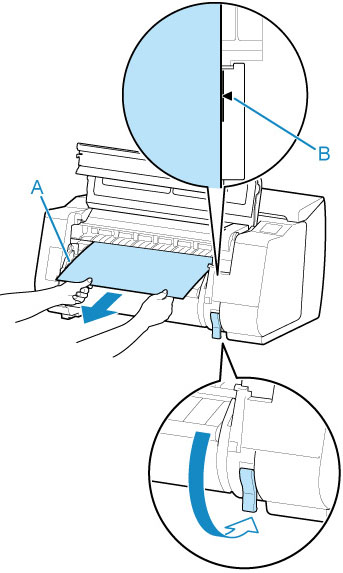Внимание!- Не прикладывайте усилий во время вытягивания рулона бумаги, чтобы выровнять его по линии для выравнивания бумаги (B). Это может привести к тому, что рулон будет подаваться под углом.
