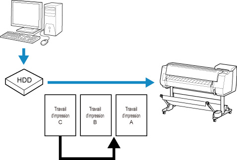 Les tâches d'impression traitées par l'imprimante sont collectivement nommées « file d'attente des tâches ». Vous pouvez supprimer ou avancer des tâches dans la file d'attente des tâches selon le besoin.