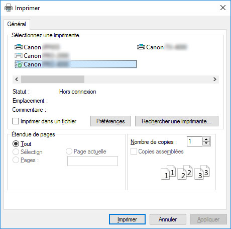 L'aspect de la boîte de dialogue dépend du logiciel de l'application. Dans la plupart des cas, la boîte de dialogue propose les options d'impression de base et vous permet de choisir l'imprimante, d'indiquer l'étendue de pages, le nombre de copies, etc.
