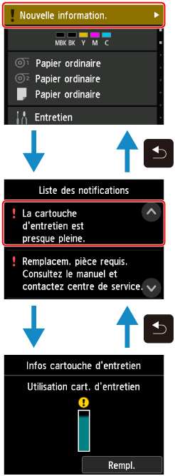 Lorsque le niveau d'encre est bas ou en cas de réception d'une nouvelle notification, Nouvelle information. apparaît dans la zone d'affichage des informations de l'imprimante. Touchez ce message pour voir l'écran Liste des notifications qui affiche les messages en montrant d'abord le plus récent. Touchez un message pour en afficher le détail et prendre les mesures qui conviennent.