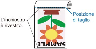 Se la carta tende a produrre polvere durante il taglio, ad esempio nel caso di pellicola retroilluminata, è possibile ridurre la polvere impostando Riduzione polvere di taglio su ATTIVATO dal menu del touchscreen; in questo modo i bordi anteriore e finale del documento stampato vengono rivestiti di inchiostro. Come risultato è possibile ridurre i problemi legati alla testina di stampa. È possibile impostare Riduzione polvere di taglio in base al tipo di supporto.