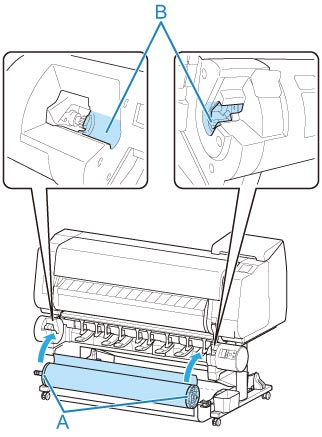 Afferrare le flange (A) in modo che l'ingranaggio bianco del supporto per rotolo si trovi a sinistra, allineare l'albero del supporto per rotolo alle scanalature di guida destra e sinistra dello slot supporto rotolo (B) ed eseguire il caricamento.