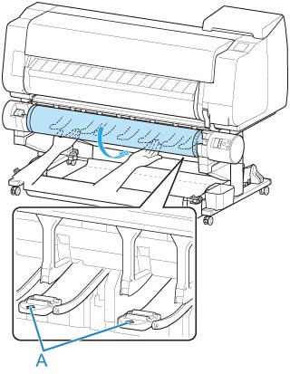 Per la procedura di fissaggio della carta in rotolo al supporto per rotolo, vedere "Caricare i rotoli nel supporto per rotolo".