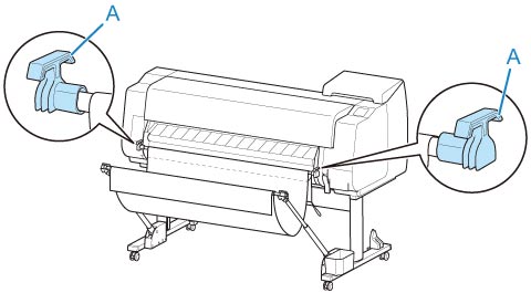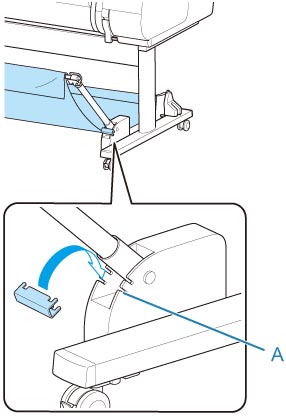 Per fissare l'asta del raccoglitore (lato del cavo) alla parte anteriore della stampante, assicurarsi che entrambe le estremità dell'asta (A) siano saldamente agganciate agli attacchi.