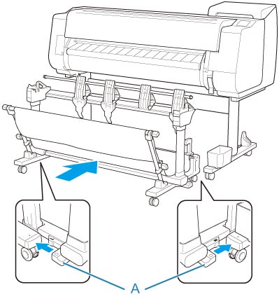 Spostare l'impilatrice sulla parte anteriore della stampante insieme al supporto, quindi spingere le parti convesse (A) su entrambi i lati della base dell'impilatrice finché non entrano in contatto con il supporto della stampante.