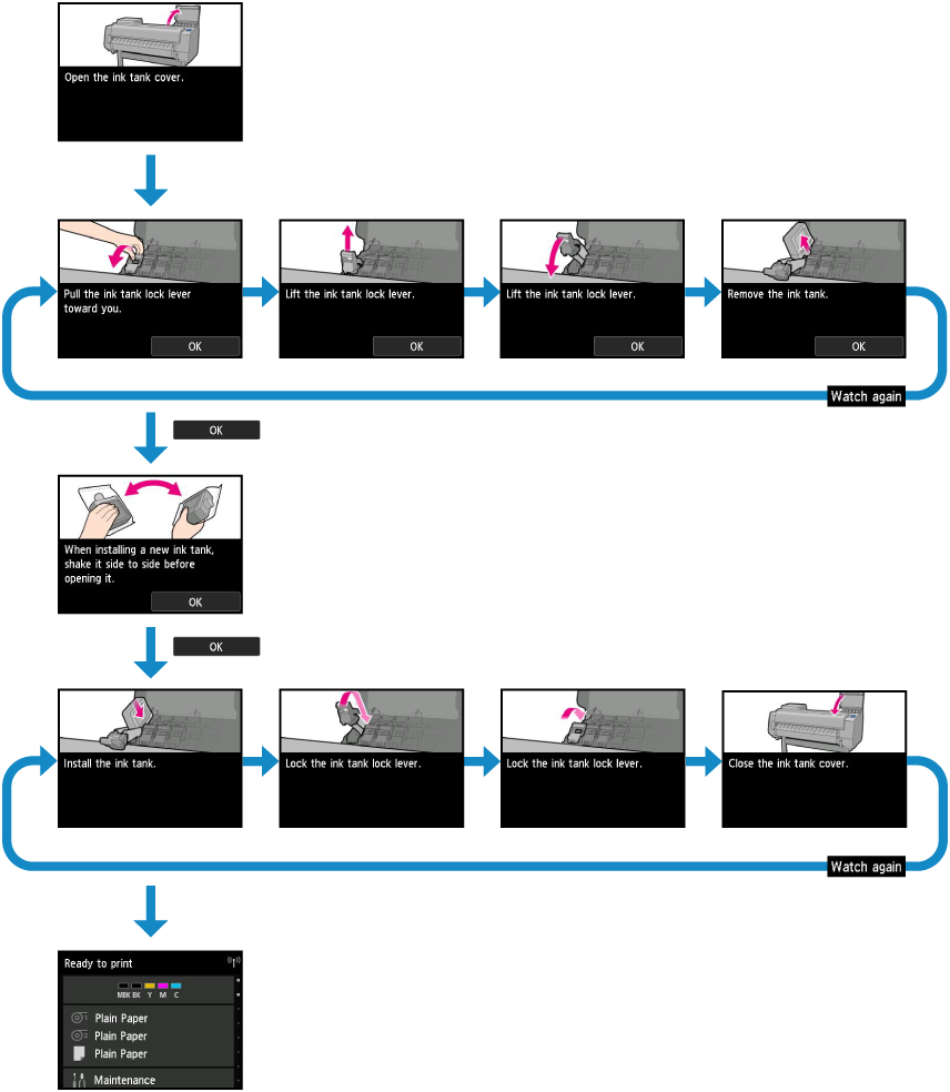 Per le azioni che la stampante non è in grado di rilevare, toccare OK per visualizzare la schermata di istruzioni per il passo successivo.